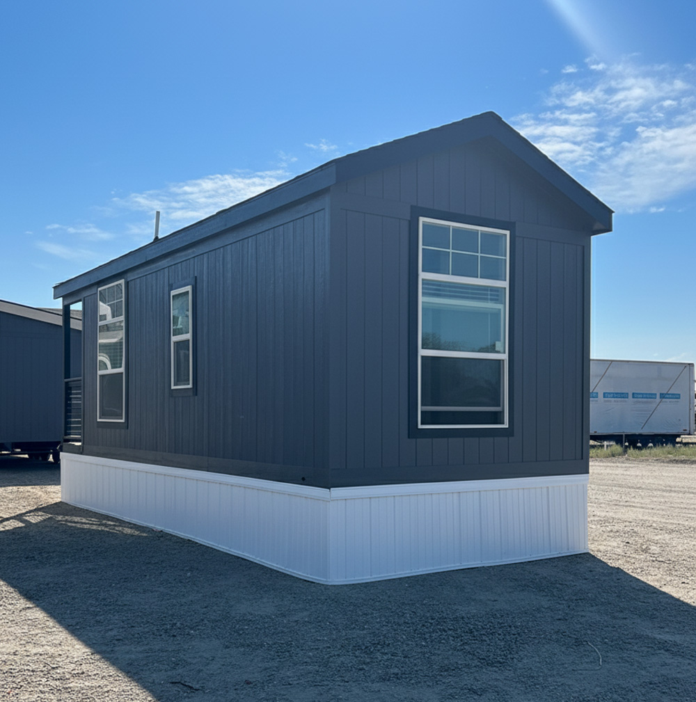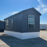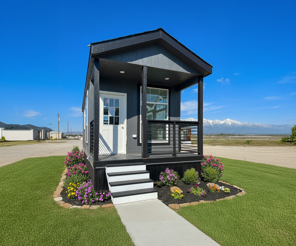- Dearborn Exterior with 4 foot porch and CemPanel Siding painted in Peppercorn with Black Magic Trim